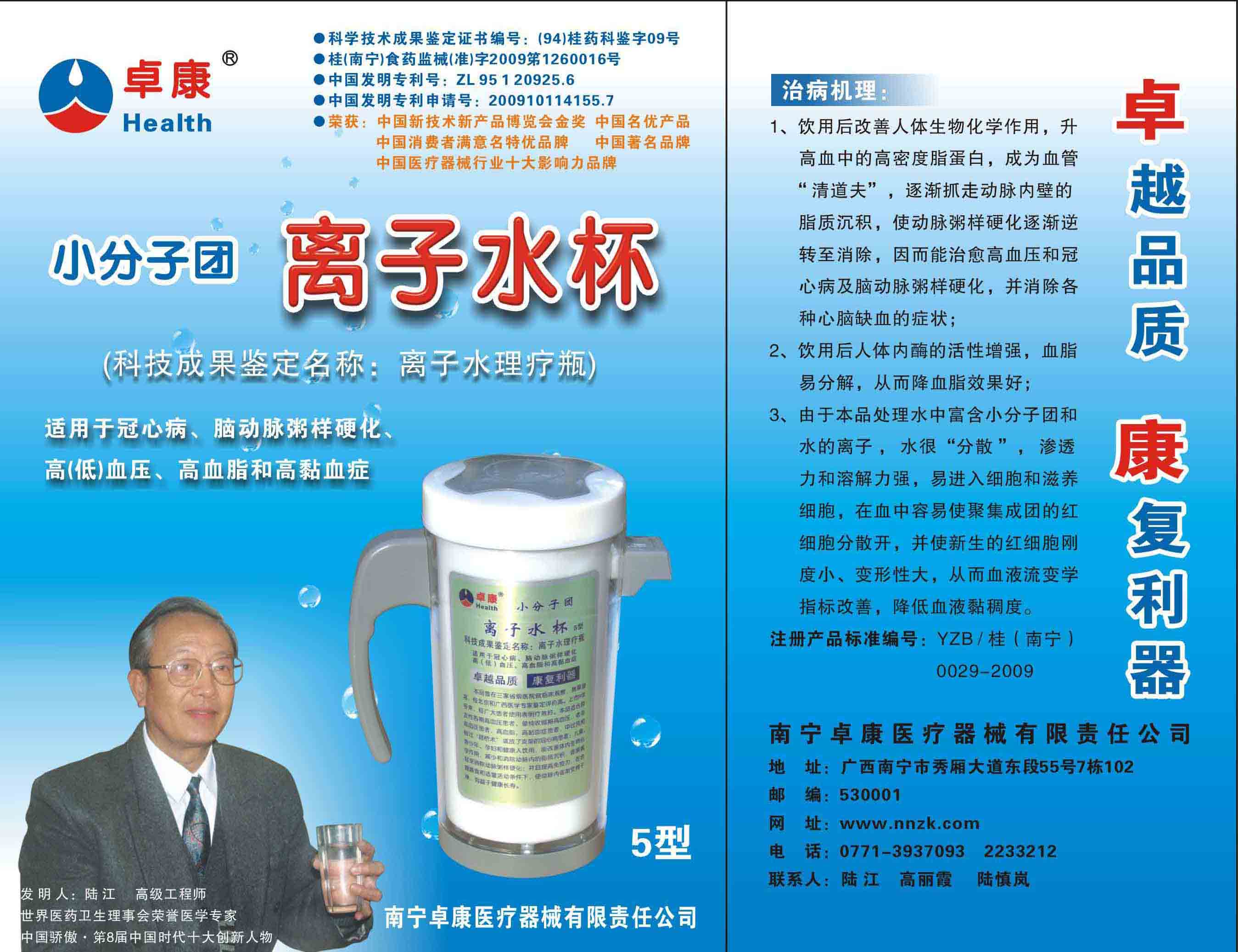 - -----南寧卓康微小水科技有限公司原為南寧卓康醫(yī)療器械有限責任公司 ,用戶普遍反饋高血壓患者飲用2—5個月,癥狀消除,不再服藥,治愈了高血壓; 冠心病患者,包括已做和未做支架或搭撟手術(shù)者,經(jīng)3—5個月飲用,消除心痛、胸悶、早搏、房顫和心絞痛等癥狀,逆轉(zhuǎn)至消除動脈粥樣硬化和斑塊,一年左右治愈冠心病,心腦電圖正常,經(jīng)冠脈造影掃描無明顯狹窄,表明冠心病痊愈;糖尿病人飲用3-10個月,血糖尿糖正常,治愈2型糖尿病; 并且使前列腺增生、低血壓、腦萎慢性咽喉炎、慢性氣管炎、支氣管炎、哮喘、矽肺病、甲亢、慢性胃腸炎、膽囊炎、慢性腎炎、腎衰、風濕性關節(jié)炎、痔瘡和濕疹皮炎及中風癱瘓或偏癱失語后遺癥等不藥而愈,且多病同治,無需終生服藥,彌補了幾千年來藥物的欠缺,使“微小水”成為人類消除高血壓、冠心病和糖尿病的寶貴資源。腦動脈粥樣硬化、低血壓和前列腺增生患者,一般飲用四個月痊愈;中風后遺癥患者,一般飲用8個月痊愈。請詳閱《用戶反饋》欄目中大量患者的反饋信、檢測報告,有的還附照片。產(chǎn)品屢獲大獎,論文也屢獲一等獎。廣大用戶好評不斷,有口皆碑。